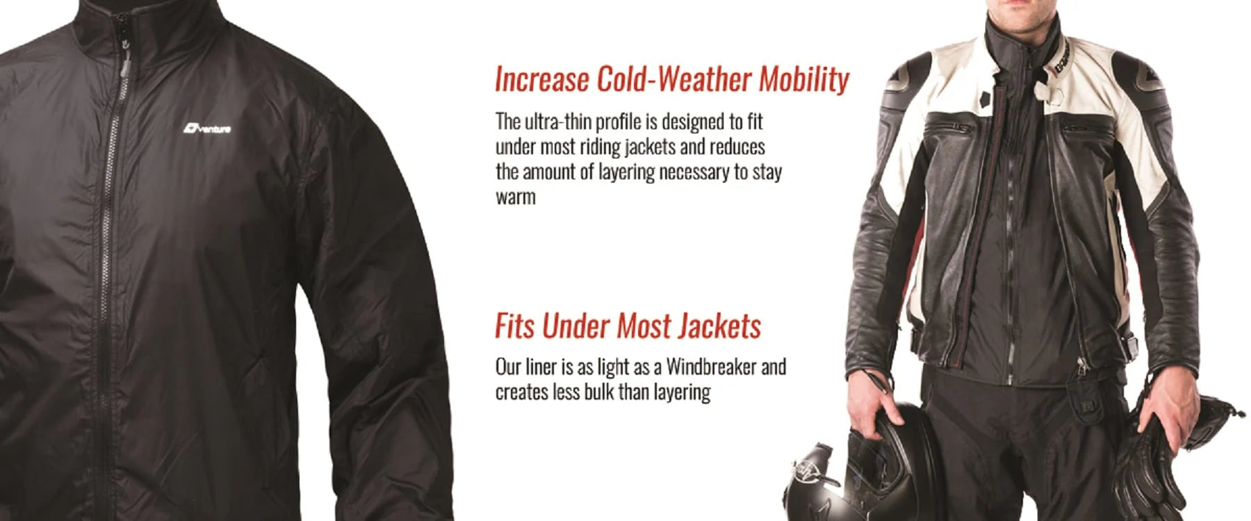 The jacket liner means you can remove all those layers and simply ride with a base layer, jacket liner and outer shell over the top. You can control you climate with a button instead of endless layers.