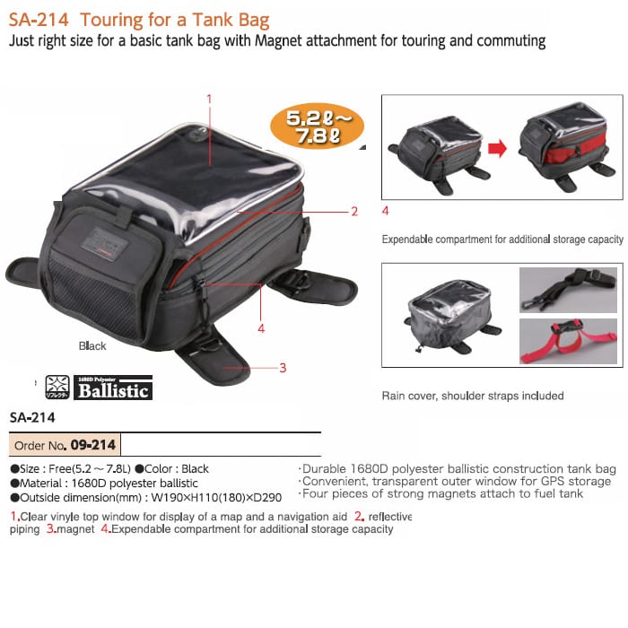 Komine SA-214 Magnetic Motorcycle Tank Bag is just the right size for a basic tank and its strong magnetic attachments make it great for touring and commuting. The zipper expansion feature can change the 5.2l capacity to 7.8l in just a few seconds, and the clear vinyl top gives easy visuals for GPS and navigation aid. Durability comes standard thanks to the 1680D polyester ballistic construction and the included rain cover keeps your items dry when the rain comes.