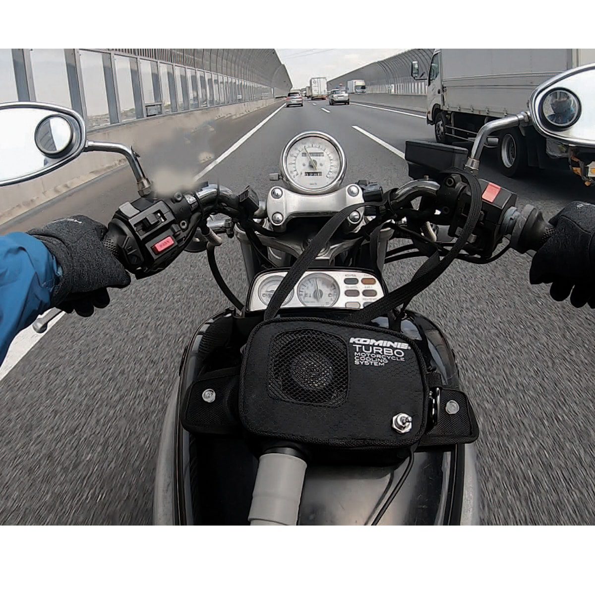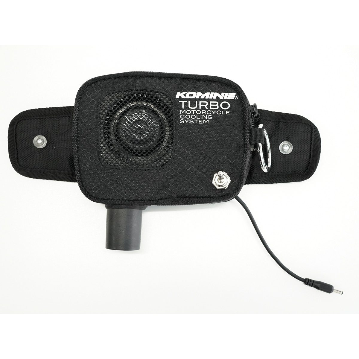 A tank bag with a turbo fan that is powered by the vehicle’s 12V battery. It is placed inside a jacket or underwear, and by blowing air into it, it evaporates sweat and cools the surface of the body with the heat of vaporization.